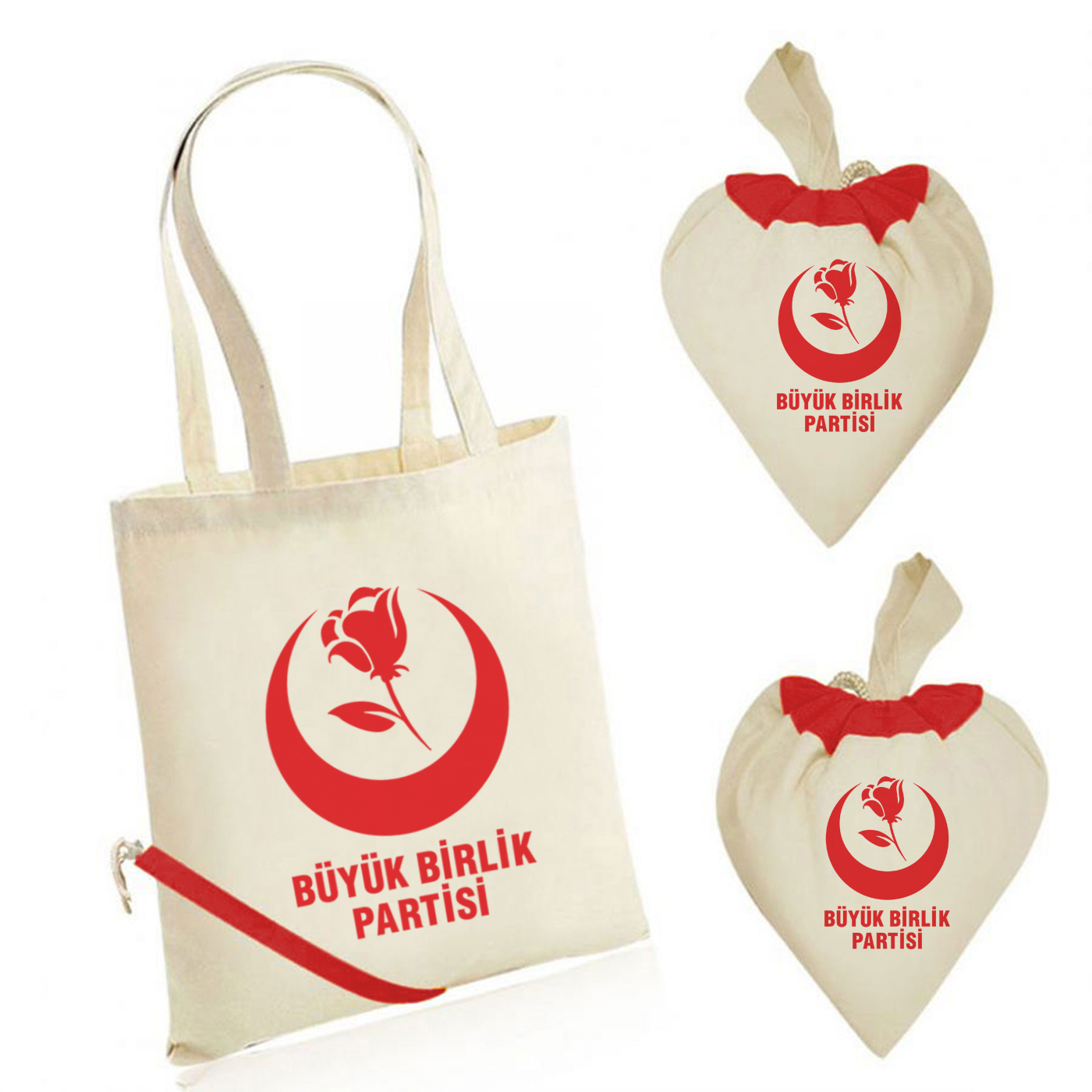Büyük Birlik Partisi Logo Baskılı Kalp Büzgülü Ham Bez Çanta