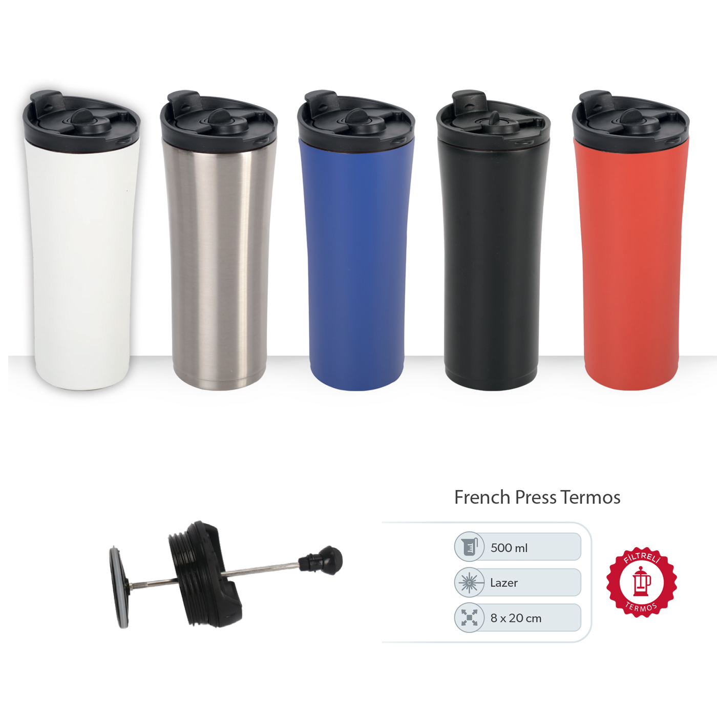 Logo baskılı french press filtreli termoslar, promosyon stratejinizle satış hedeflerinizi destekler.