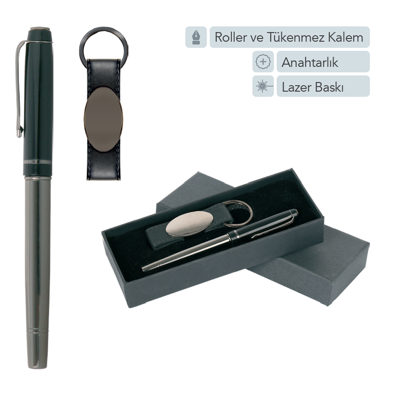 Logo baskılı promosyon kutulu roller kalem ve anahtarlık setiyle markanızı göz önünde tutun