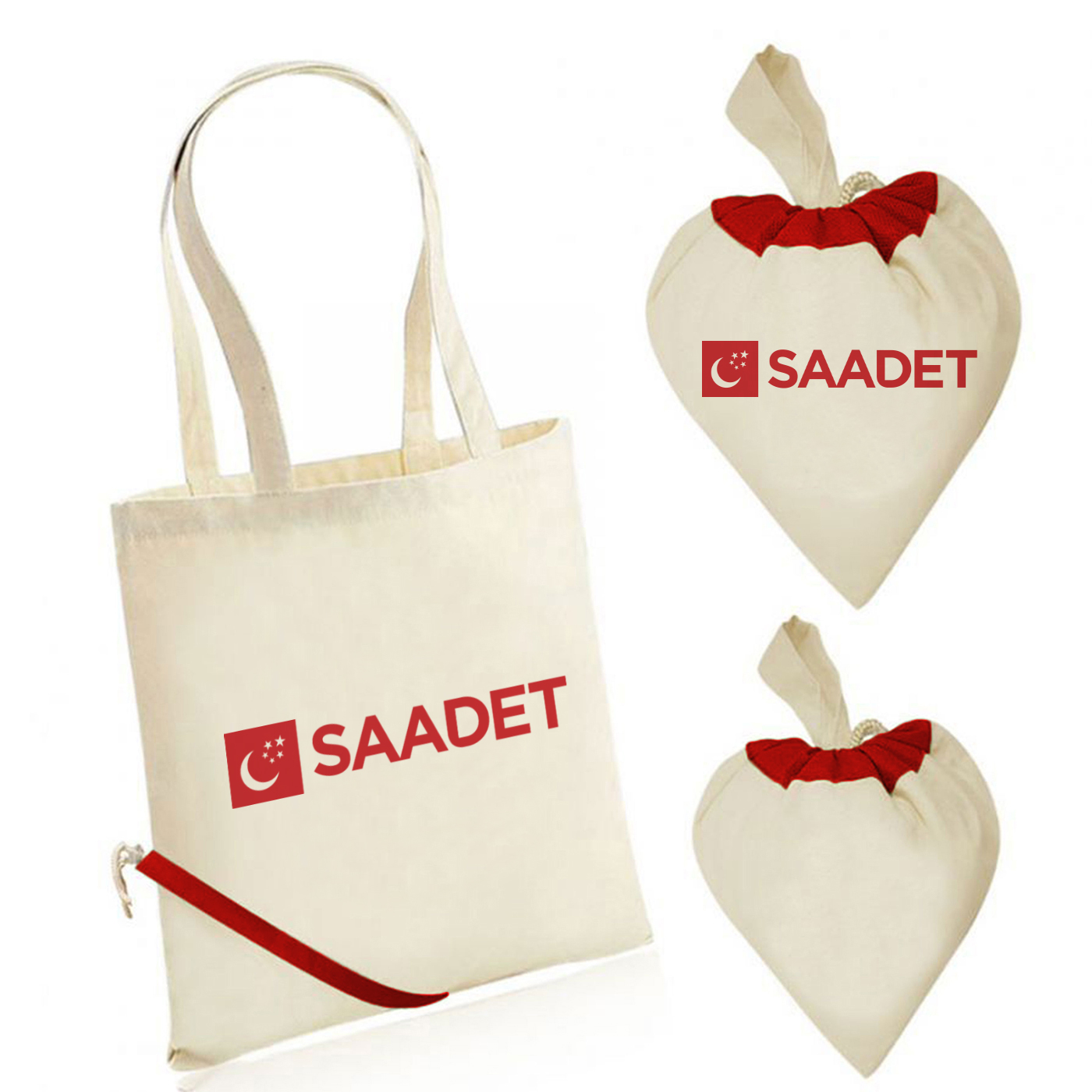Saadet Partisi Logo Baskılı Kalp Büzgülü Ham Bez Çanta